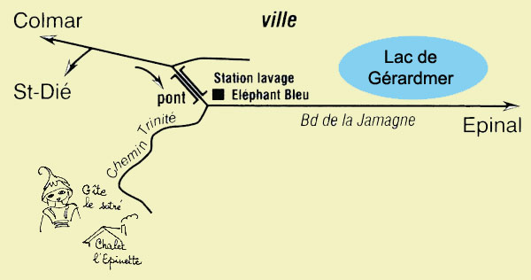 Depuis Saint-Dié, Colmar : à l'entrée de la ville, circuler sur la file de droite direction Epinal, et traverser le grand pont sur une scierie, puis prendre le chemin de la Trinité, immédiatement à droite, à la sortie du pont, monter environ 500 m. et vous découvrirez notre chalet.